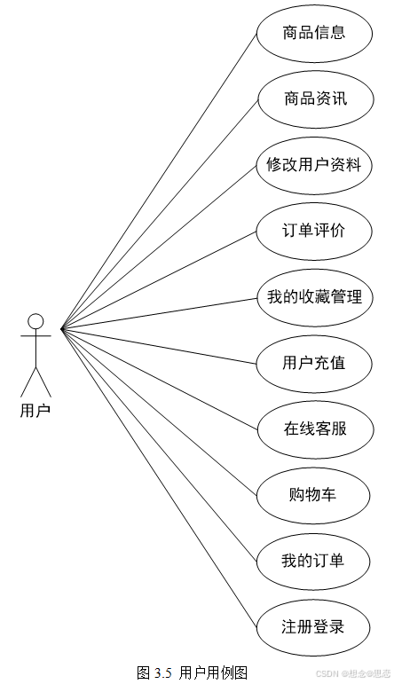 设计的用户的详细功能见下图,用户收藏商品,订购商品,管理个人订单,联系客服,在线充值。