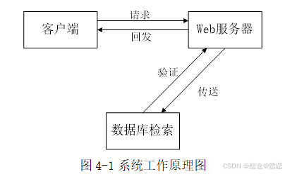 本系统采用B/S结构(Browser/Server,浏览器/服务器结构)和基于Web服务两种模式,是一个适用于Internet环境下的模型结构。只要用户能连上Internet,便可以在任何时间、任何地点使用。系统工作原理图如图4-1所示: