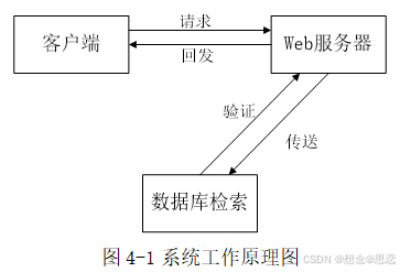本系统后台采用B/S结构(Browser/Server,浏览器/服务器结构)和基于Web服务两种模式,是一个适用于Internet环境下的模型结构。只要用户能连上Internet,便可以在任何时间、任何地点使用。系统工作原理图如图4-1所示: