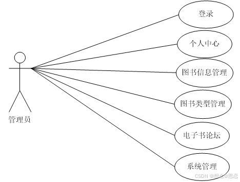 管理员可进行后台进行管理,包含个人中心、图书信息管理、图书类型管理、电子书论坛以及系统管理。