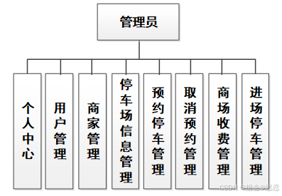 本停车场微信小程序有管理员,用户,以及商家三个角色。管理员功能有个人中心,车主管理,商家管理,停车场信息管理,预约停车管理,取消预约管理,进场停车管理,商场收费管理,留言板管理,系统管理等。商家可以提交停车信息,用户可以停车。