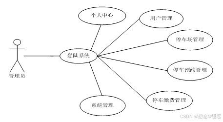 管理员可登录系统后台,登录后可对系统进行全面管理,包括个人中心、用户管理、停车场管理、停车预约管理、停车缴费管理以及系统管理,管理员用例图如图3-2所示。