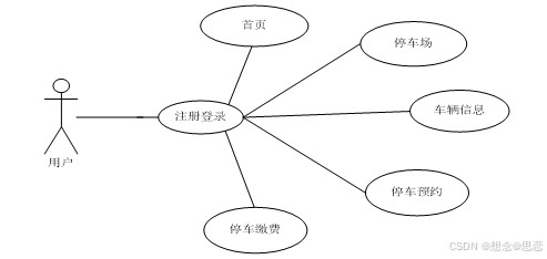 用户通过微信平台可打开系统,注册登录后主要功能模块包括首页、停车场(可查看停车场,选择车位进行预约)以及我的(车辆信息、停车场、停车预约、停车缴费),用户用例图如图3-1所示。