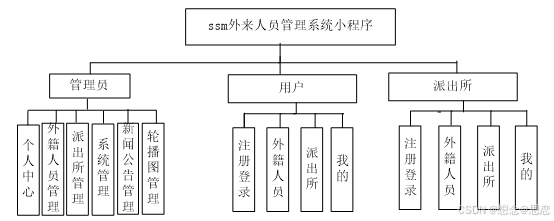 基于微信的基于微信小程序的外来人员管理系统小程序的设计基于现有的个人中心、外籍人员管理、派出所管理、系统管理等功能。方便用户对基于微信小程序的外来人员管理系统查看首页、外来人口、派出所、我的等功能模块,进行相对应操作。根据系统功能需求建立的模块关系图如下图: