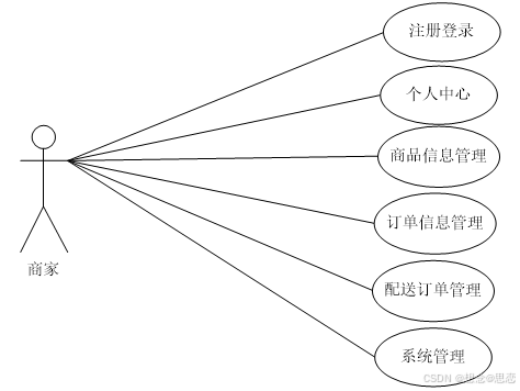 商家注册登录后主要功能模块包括个人中心、商品信息管理、订单信息管理、配送订单管理以及系统管理。
