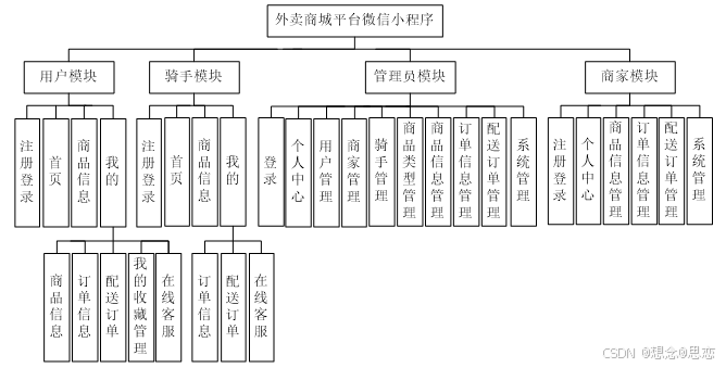 本外卖商城平台微信小程序主要实现了商家功能模块、骑手功能模块、用户功能模块和管理员功能模块四大部分,系统结构图如图4-1所示。