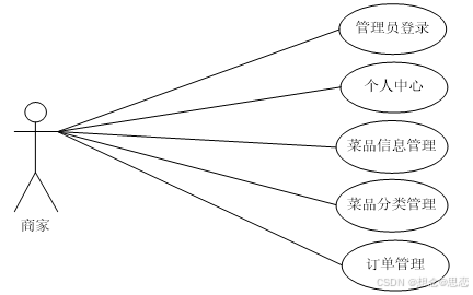(2)商家登录后主要功能模块包括个人中心、菜品信息管理、菜品分类管理以及订单管理。商家用例如图3-2所示。
