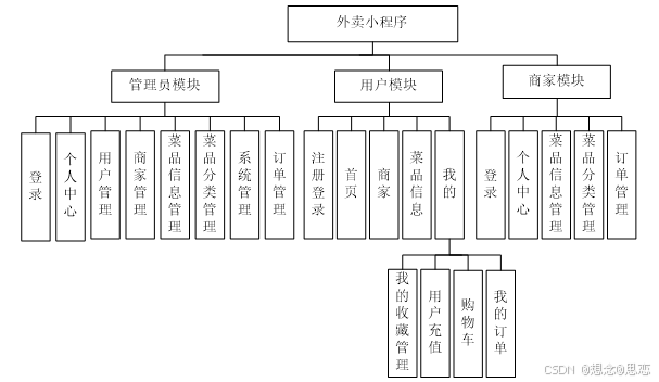 本外卖小程序主要满足3种用户的需求,这3种用户分别为管理员、商家以及用户,下面将对这三类用户分别进行功能需求分析方面的阐述。