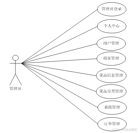 (1)管理员可登录系统后台,对系统进行全面管理,管理员登录主要功能模块包括个人中心、用户管理、商家管理、菜品信息管理、菜品分类管理、系统管理以及订单管理。管理员用例如图3-1所示。