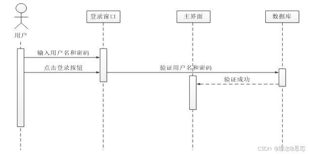 用户在登录时,首先进入系统登录窗口,用户需要输入用户名和密码,点击登录按钮进行登录操作,系统会以用户名和密码为参数在数据库中进行登录信息的验证,验证成功则登录成功,进入对应用户主界面。登录模块顺序图如图4-2所示。
