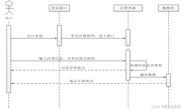 未有账号的用户可进入注册界面进行注册操作,在注册界面输入注册信息,点击提交按钮,系统首先判断用户名是否存在,存在则提示重新输入,不存在则验证注册信息是否正确,正确则在数据库中添加注册数据,提示注册成功。用户注册模块顺序图如图4-3所示。