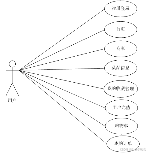 (3)用户通过微信客户端可进入本外卖小程序,注册登录后主要功能模块包括首页、商家、菜品信息以及我的(我的收藏管理、用户充值、购物车以及我的订单)。用户用例图如图3-3所示。