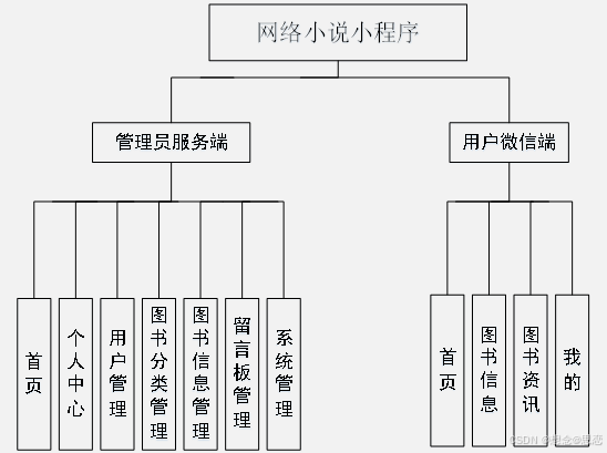 网络小说小程序,主要包括管理员、用户二个权限角色,对于用户角色不同,所使用的功能模块相应不同。