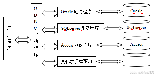 开放数据库互连(Open DataBase Connectivity,ODBC)是Microsoft公司开发的一套开发数据库系统应用程序接口规范,它支持应用程序以标准的ODBC函数和SQL语句操作各种不同的数据库。在这一实现过程中,ODBC驱动程序起了关键作用,简单地说,ODBC驱动程序相当于一个转换开关,它负责将应用程序发送来的标准SQL语句传递给各种数据库驱动程序处理,再将处理结构送回使用程序。于是,应用程序开发者只须面对统一的ODBC数据源,而不必针对各种数据库进行不同的设置,这样的程序具备更好的适用性和可移植性,甚至可以访问多种不同的数据库,如图2所示