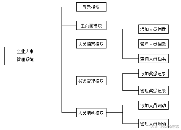 人事管理系统由人员信息管理、人员调动信息管理、系统用户管理等几个部分组成,规划系统功能模块如下: