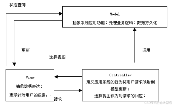 MVC模式的出现,很好的解决了传统开发WEB应用方式中存在的问题。M代表模型(Model),包含完成任务所需要的所有的行为和数据;V代表视图(View)界面,显示模型提供的数据;C代表控制器(Controller),它将模型映射到界面中,处理用户的输入并响应请求。其模型关系如图所示。在MVC模式中,三层各尽其职、相对独立,各层内部的改变不会影响到其它层,从而降低了数据表达、数据描述和应用操作的耦合度,也能更好的实现开发中的分工,加快工程进度。