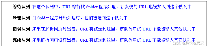 虽然这里只描述了一个队列,但在实际编程中用到了四个队列,他们每个队列都保存着同一处理状态的URL。