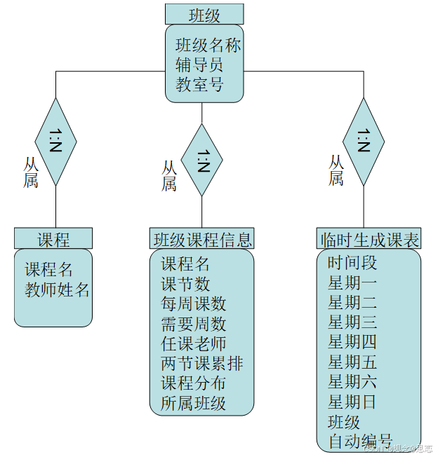 班级与临时生成课表是一对多的关系,一个班级,只能有一个课程表,而排列的方式都同样由班级获得。