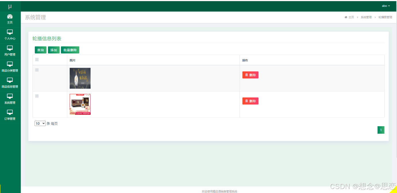 轮播图;该页面为轮播图管理界面。管理员可以在此页面进行首页轮播图的管理,通过新建操作可在轮播图中加入新的图片,还可以对以上传的图片进行修改操作,以及图片的删除操作,如图5-12所示。