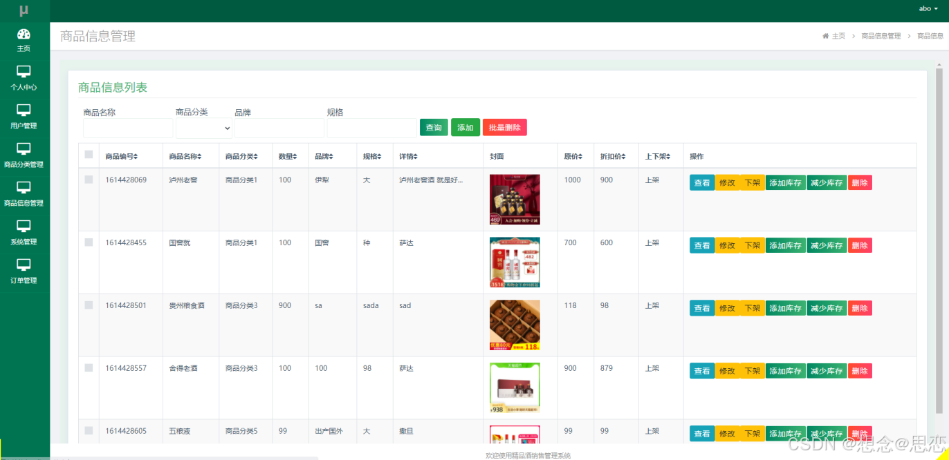 商品信息管理:管理员通过列表可以获取商品编号、商品名称、商品分类、数量、品牌、规格、封面、价格、详情等信息,进行修改或删除操作,如图5-11所示。