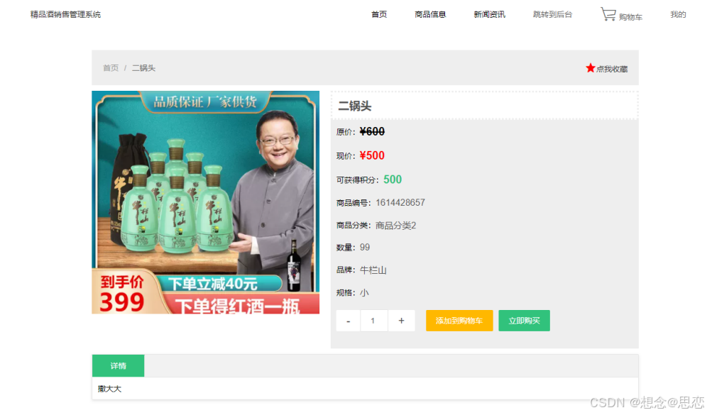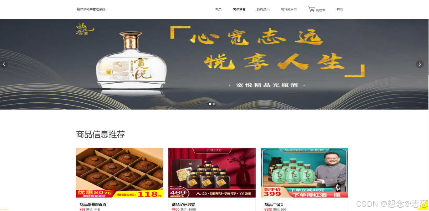精品酒销售管理系统,在精品酒销售管理系统可以查看商品信息、新闻资讯、我的、跳转到后台、购物车等内容,如图5-17所示。