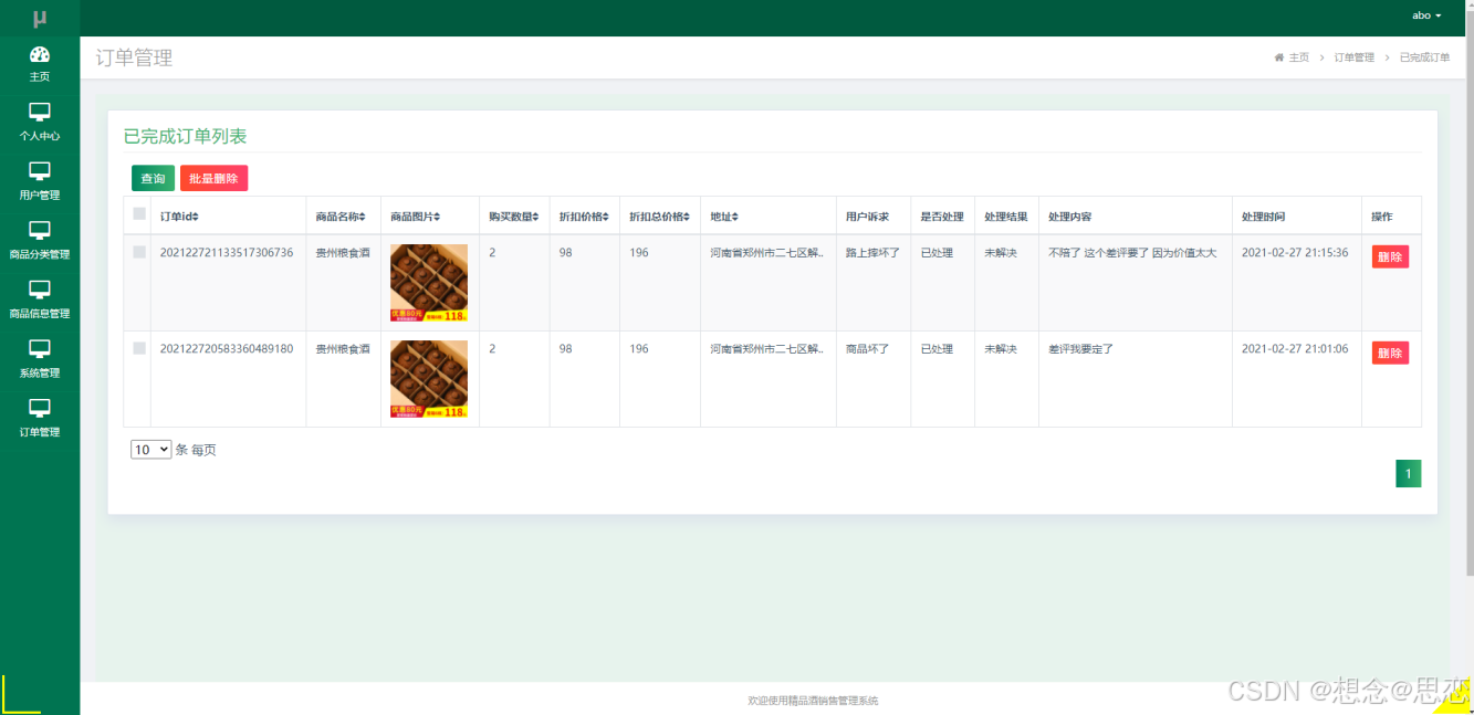 已完成订单:管理员通过列表可以获取订单id、用户id、商品id、商品名称、商品图片、购买数量、价格/积分、折扣价格、总价格/总积分、折扣总价格、支付类型、状态、地址等信息,进行修改或删除操作,如图5-14所示。