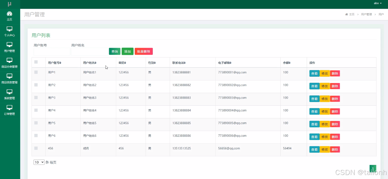 用户管理:通过列表可以获取用户账号、用户姓名、密码、性别、联系电话、电子邮箱、余额等信息,进行修改或删除操作,如图5-9所示。