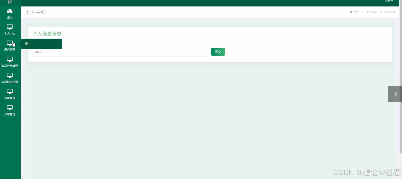 管理员通过用户名和密码填写完成后进行登录,如图5-6所示。管理员登录成功后进入到系统操作界面,可以对主页、个人中心、用户管理、商品分类管理、商品信息管理、系统管理、订单管理等功能模块进行相对应操作。