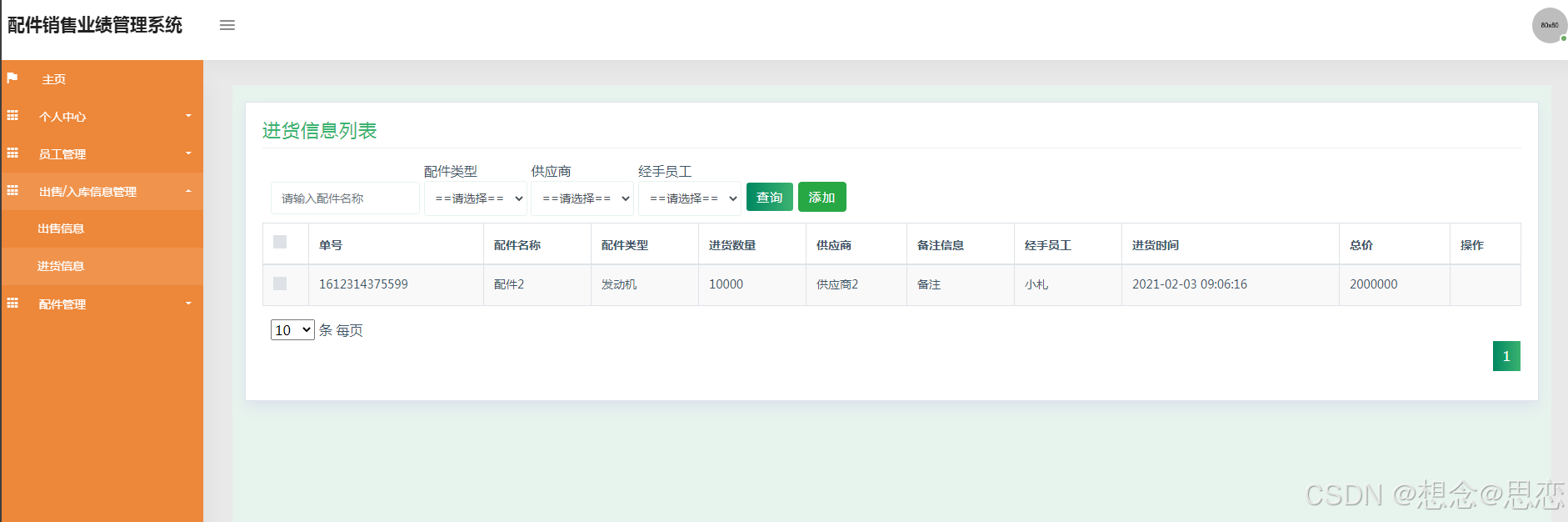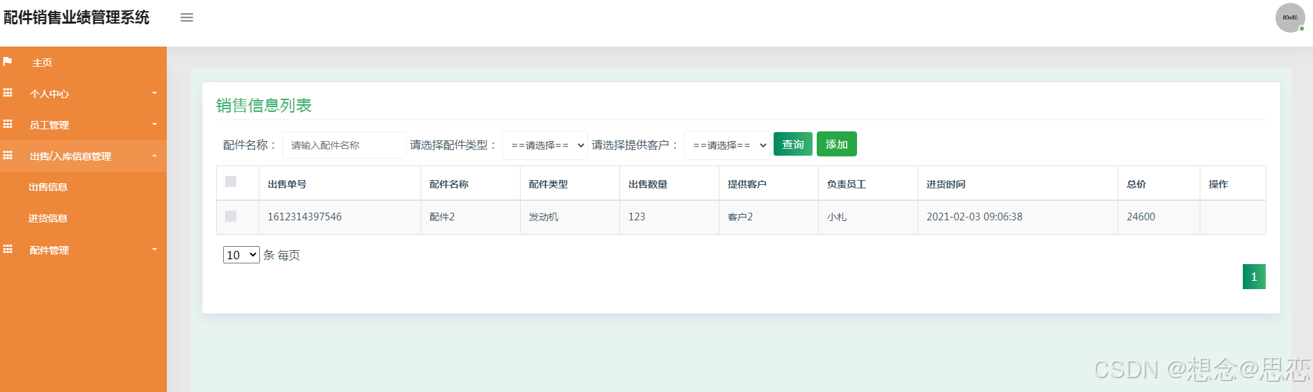 实现员工权限的出售信息功能,其运行效果见下图。员工出售配件之后,需要在此页面登记出售信息,也能查询员工本人已经出售的配件信息。