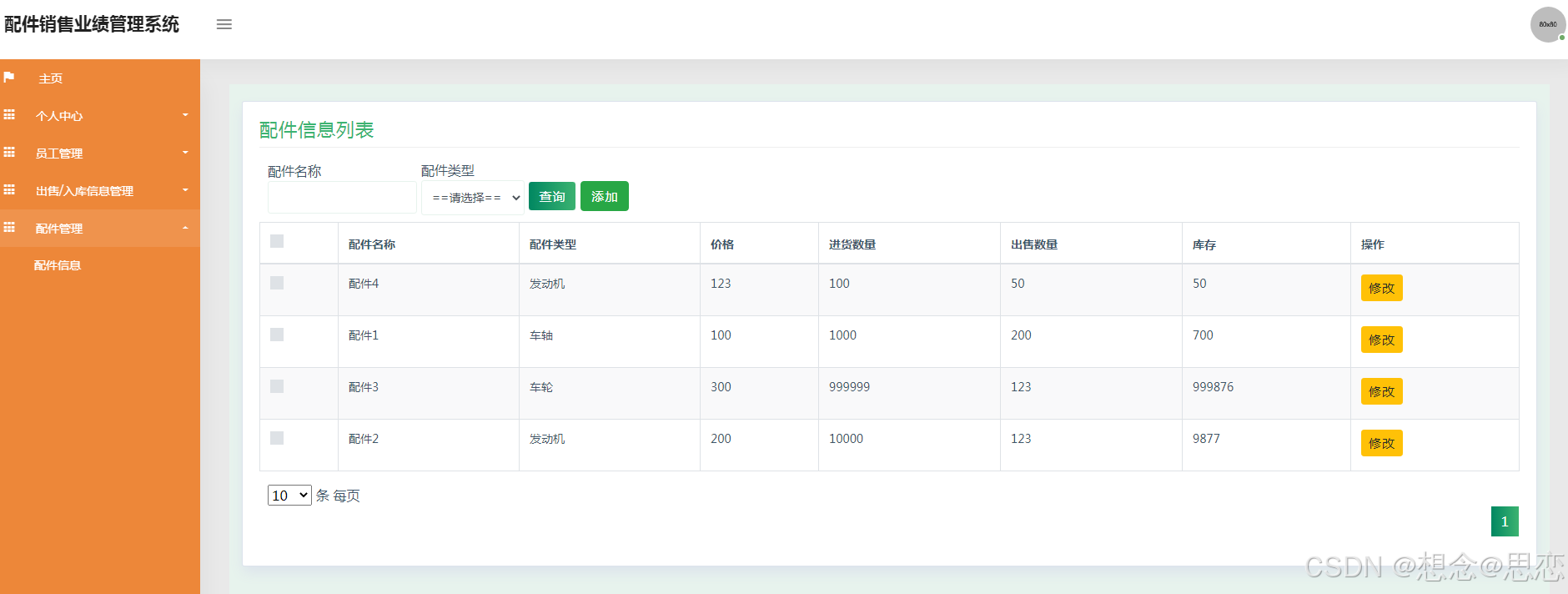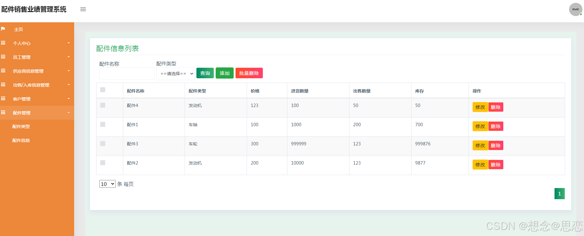 实现员工权限的配件管理功能,其运行效果见下图。员工不可以删除配件,可以添加,查询或修改配件。