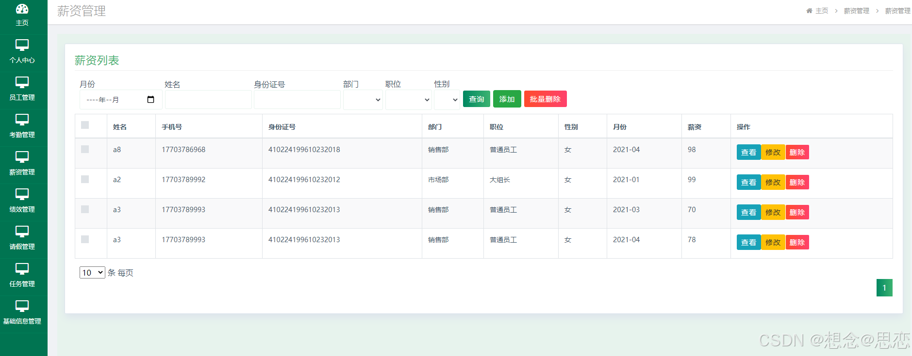 如图5.3显示的就是薪资管理页面,此页面提供给管理员的功能有:添加员工薪资列表,删除薪资,修改薪资和查看员工薪资。