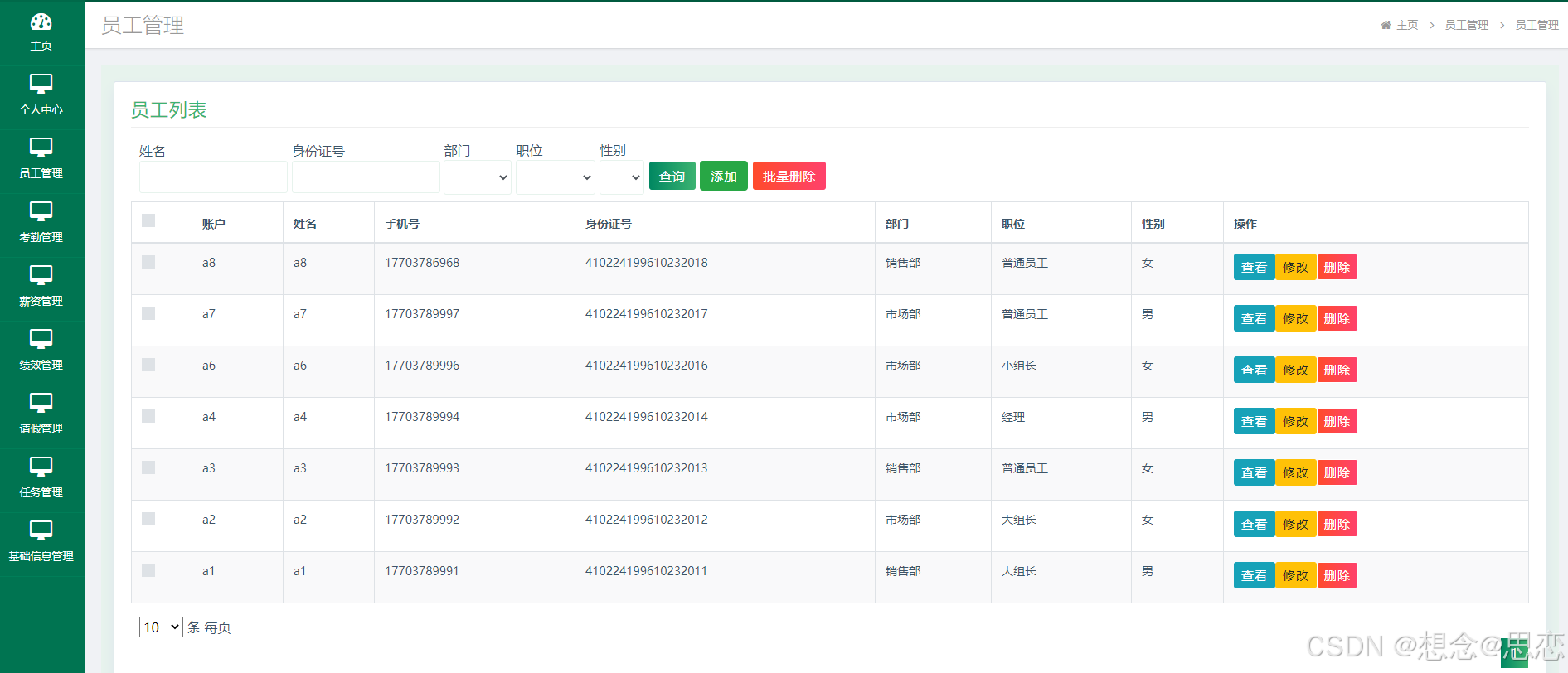 实现了员工基础数据的管理,考勤管理,薪资管理,绩效管理,请假管理,任务管理等功能。人事管理信息系统的开发根据操作人员需要设计的界面简洁美观,在功能模块布局上跟同类型网站保持一致,程序在实现基本要求功能时,也为数据信息面临的安全问题提供了一些实用的解决方案。可以说该程序在帮助管理者高效率地处理工作事务的同时,也实现了数据信息的整体化,规范化与自动化。