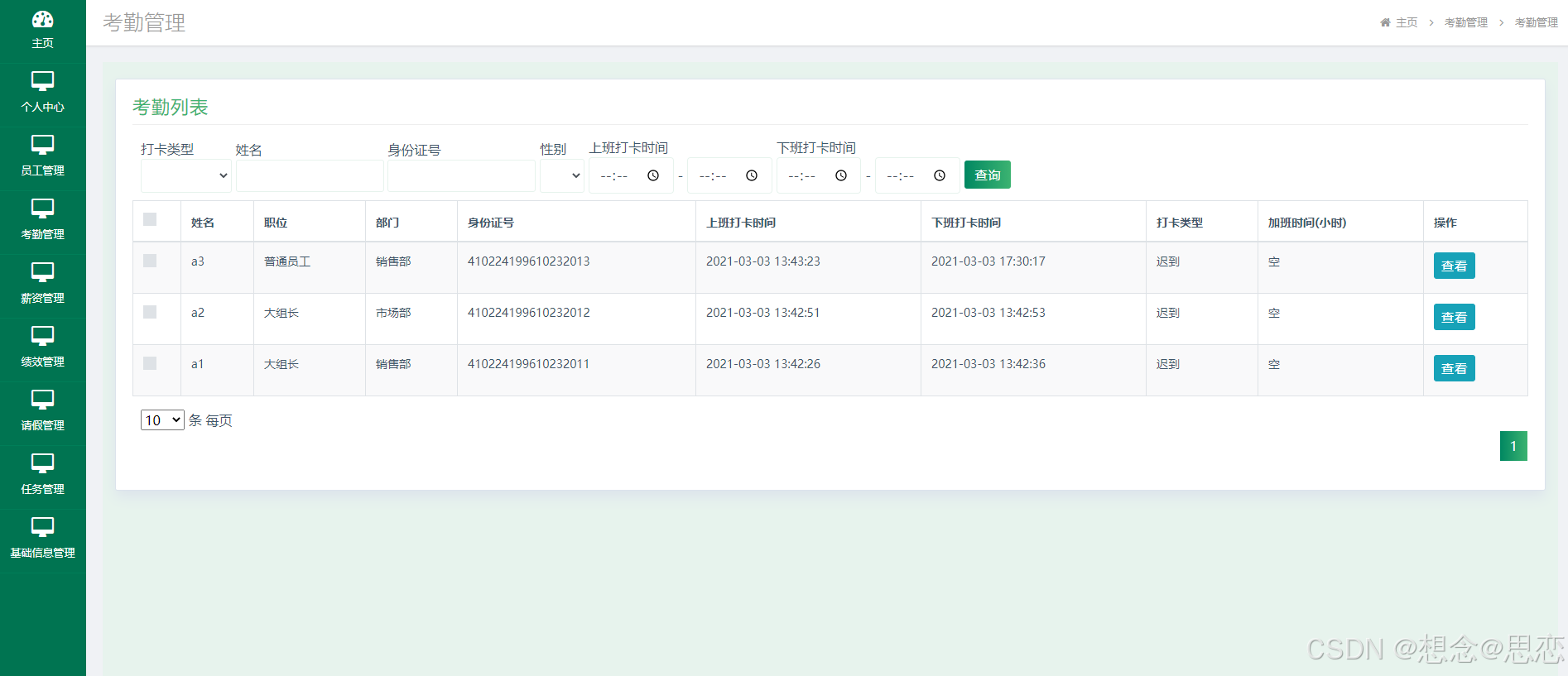 如图5.2显示的就是考勤管理页面,此页面提供给管理员的功能有:查看考勤记录。