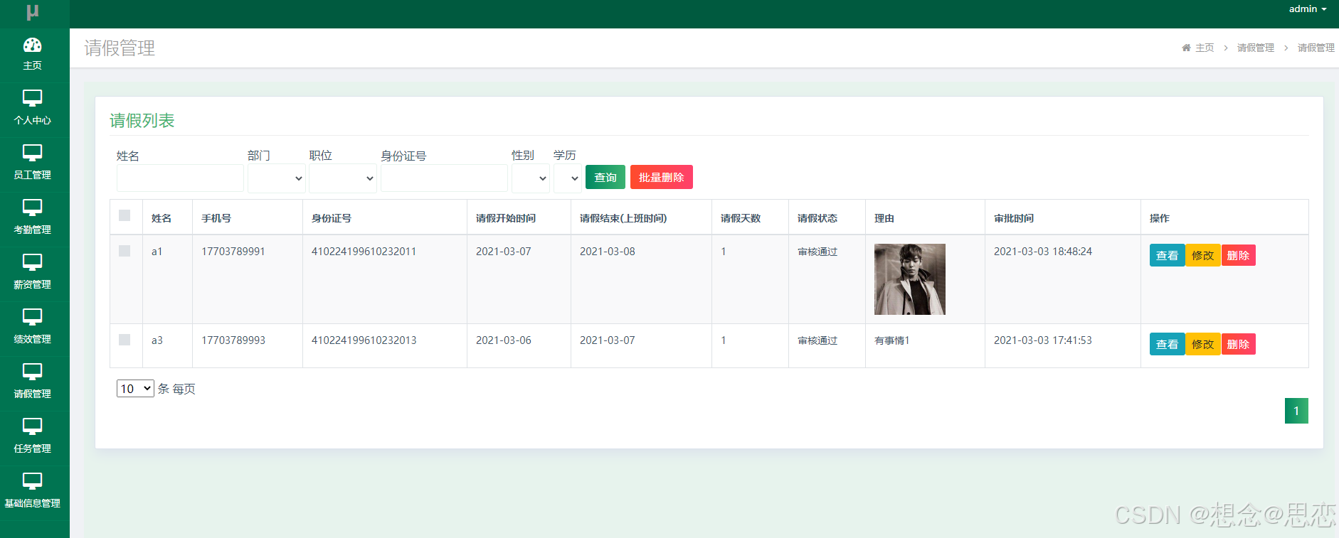 如图5.4显示的就是请假管理页面,管理员可以对请假信息进行修改,也就是审核,可以对请假信息进行查看和删除。