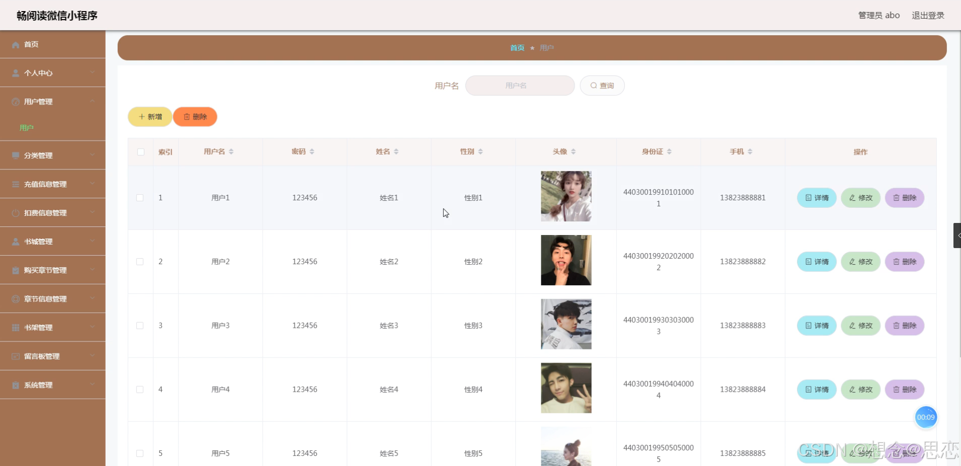 用户管理,在用户列表可以查看用户名、密码、姓名、性别、头像、身份证、手机等内容,并可根据需要进行修改或删除等详细操作,如图5-9所示。