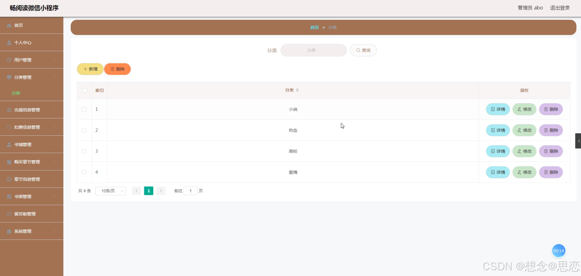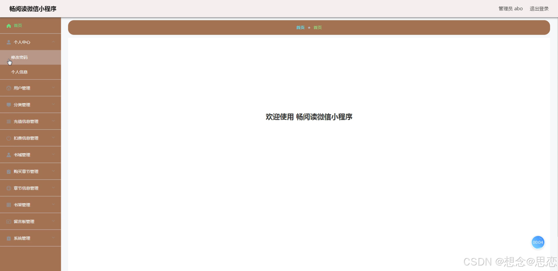 在管理员功能页面可以查看首页、个人中心、用户管理、分类管理、充值信息管理、扣费信息管理、书城管理、购买章节管理、章节信息管理、书架管理、留言板管理、系统管理等内容进行相对应操作,如图5-8所示。