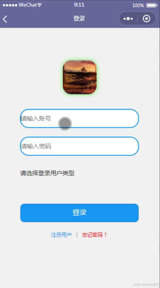 畅阅读微信小程序登录界面,通过填写账号、密码、登录用户类型等信息进行登录,如图5-1所示。
