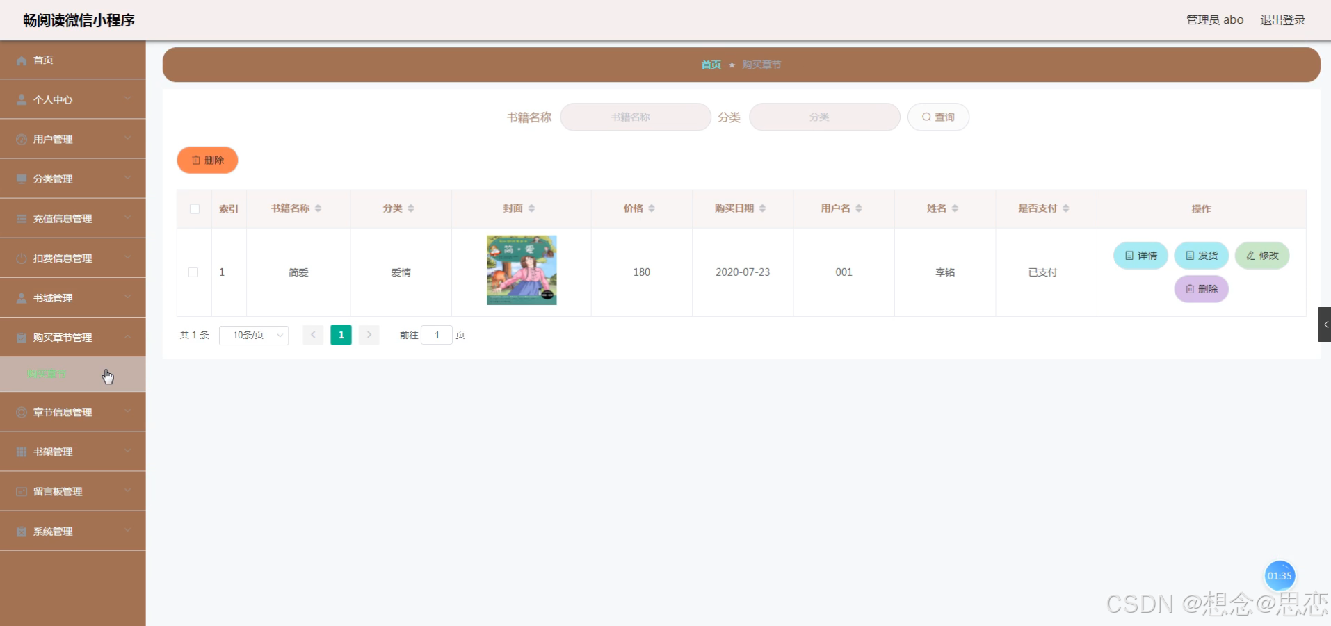 购买章节管理,在购买章节列表可以查看书籍名称、分类、封面、价格、购买日期、用户名、姓名、是否支付等内容,并可根据需要进行发货,修改或删除等详细操作,如图5-14所示。