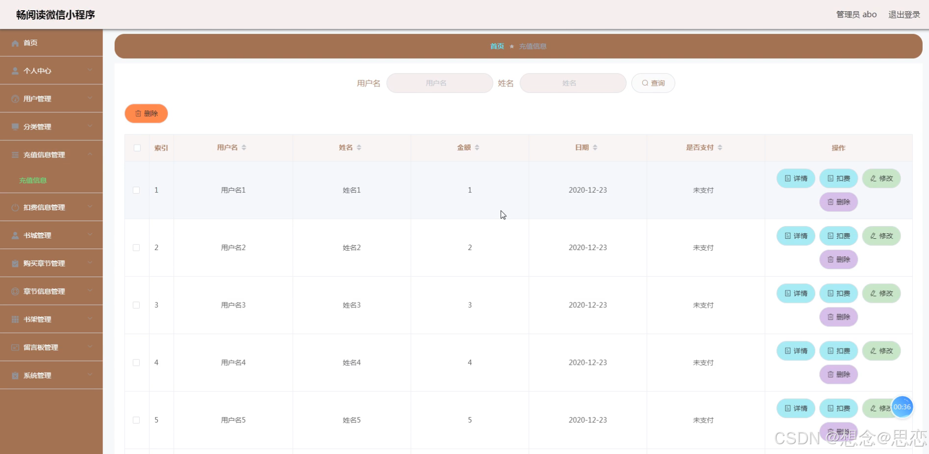 充值信息管理,在充值信息列表可以查看用户名、姓名、金额、日期、是否支付等信息,并可根据需要进行修改或删除等详细操作,如图5-11所示。