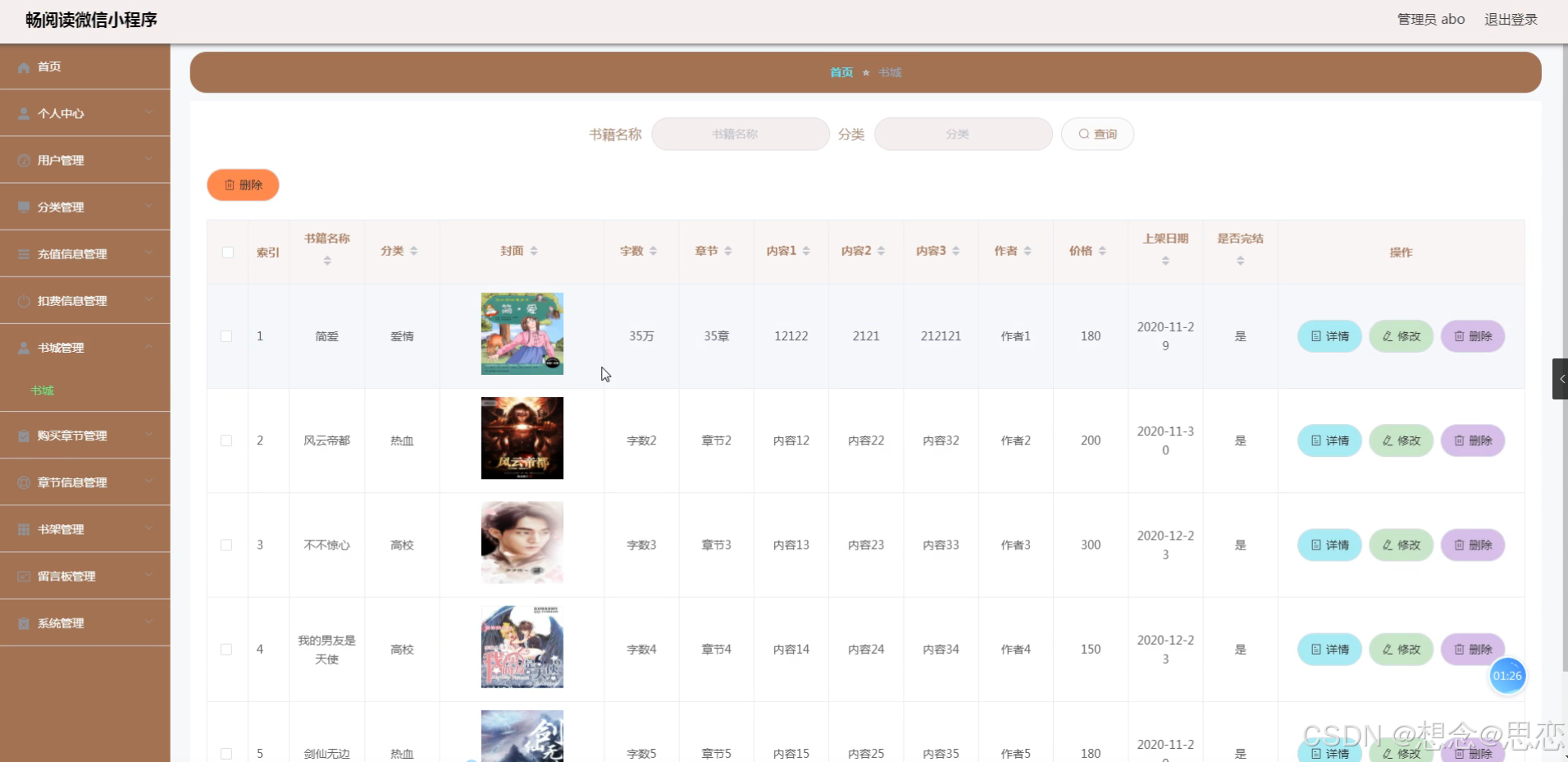 书城管理,在书城列表可以查看书籍名称、分类、封面、字数、章节、内容1、内容2、内容3、作者、价格、上架日期、是否完结等内容,并可根据需要进行修改或删除等详细操作,如图5-13所示。