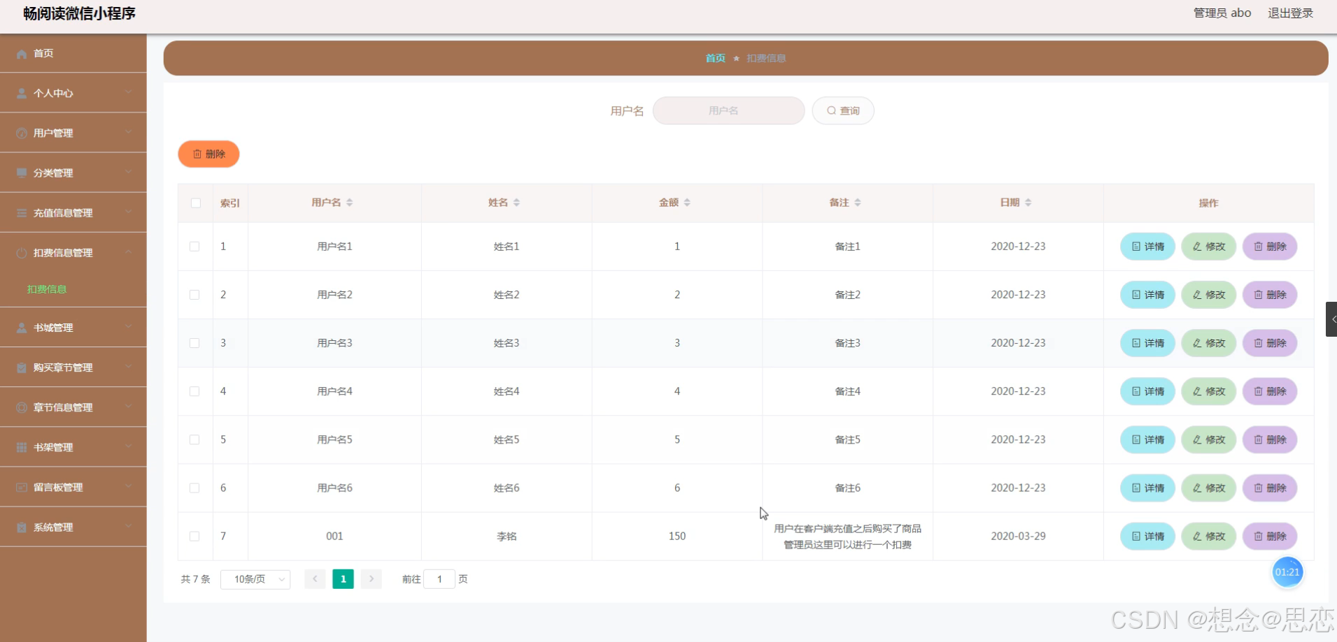 扣费信息管理,在扣费信息列表可以查看用户名、姓名、金额、备注、日期等内容,并可根据需要进行修改或删除等详细操作,如图5-12所示。