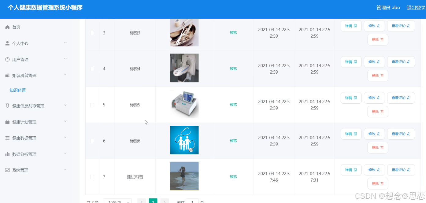 系统管理员可以查看健康计划,并且可以对健康计划的信息进行添加修改删除操作。界面如下图所示: