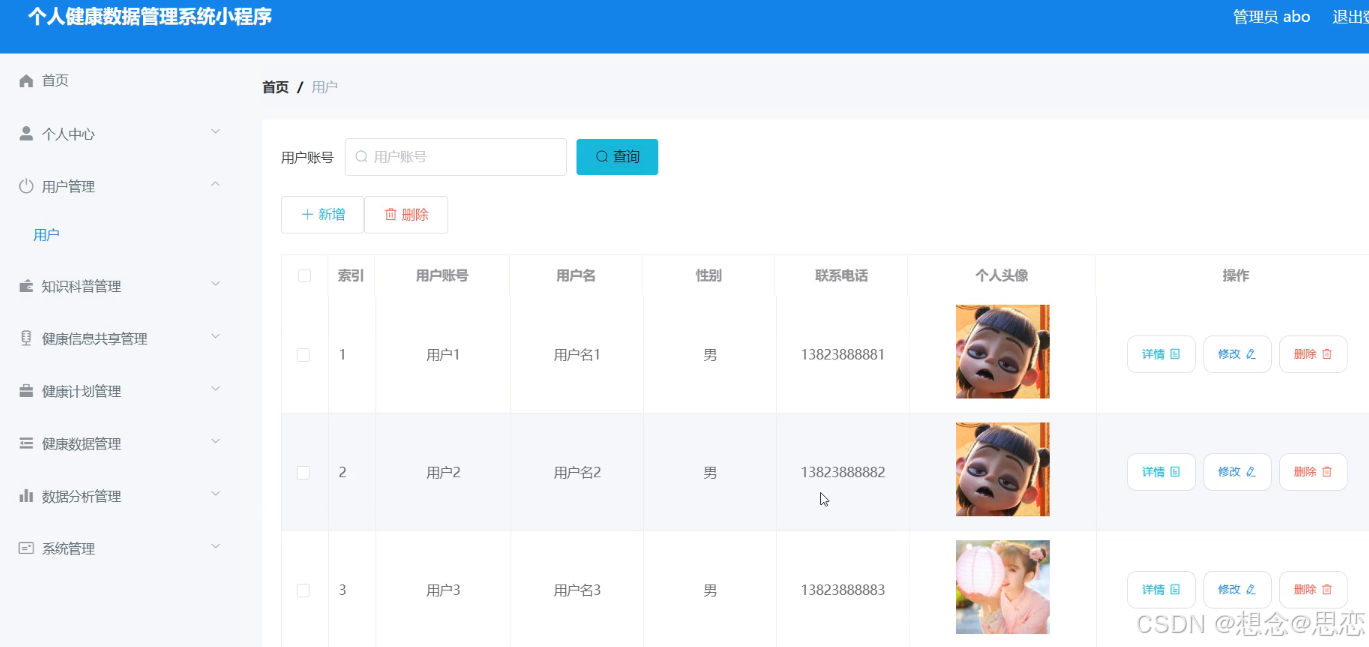 管理员可以管理用户信息,可以对通过微信小程序端注册的用户信息修改删除。具体界面的展示如图5.1所示。