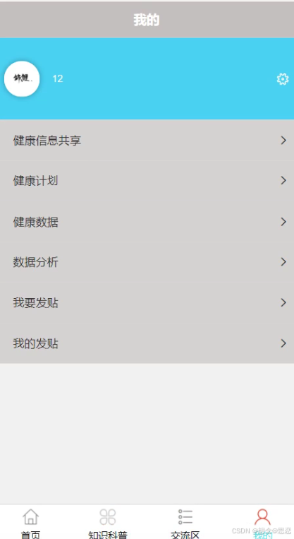 本基于微信小程序的个人健康数据管理系统管理员功能有个人中心,用户管理,知识科普管理,健康信息共享管理,健康计划管理,健康数据管理,数据分析管理,系统管理等。用户功能有个人中心,知识科普,交流区,健康信息共享,健康计划,健康数据,数据分析,我要发贴,我的发帖等。