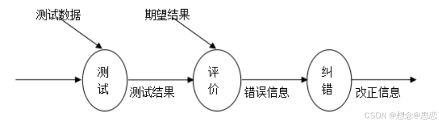 任务:消除软件故障,保证程序的可靠运行。测试与纠错的关系,可以用图6-1的数据流图来说明。图中表明,每一次测试都要准备好若干必要的测试数据,与被测试程序一道送入计算机执行。通常把一次程序执行需要的测试数据,称为一个“测试用例(Test Case)。每一个测试用例产生一个相应的“测试结果”。如果它与“期望结果”不想符合,便说明程序中存在错误,需要用纠错来改正。