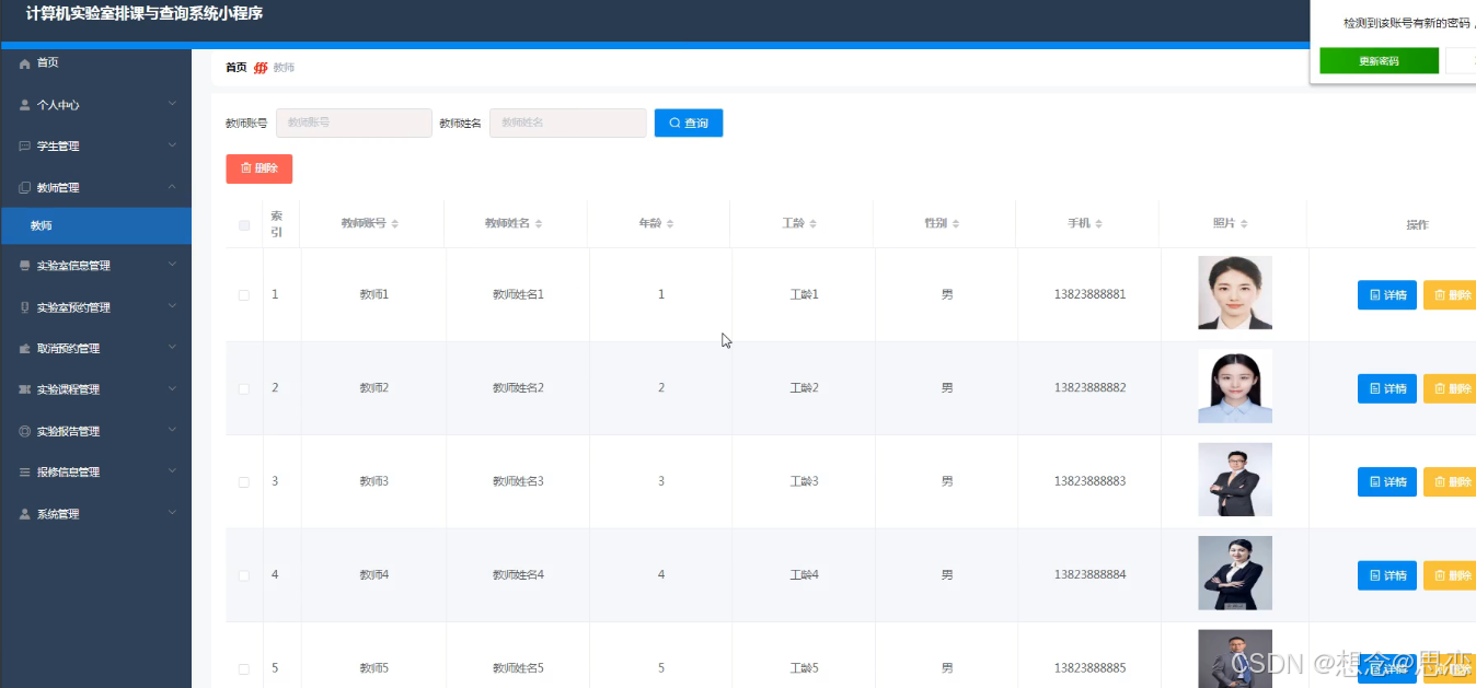 管理员可以对教师信息进行查询修改,删除操作。具体界面如图5.2所示。