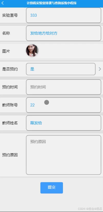 本基于微信小程序的计算机实验室排课与查询系统管理员功能有个人中心,学生管理,教师管理,实验室信息管理,实验室预约管理,取消预约管理,实验课程管理,实验报告管理,报修信息管理,系统管理等。其他用户可以对实验室进行预约。