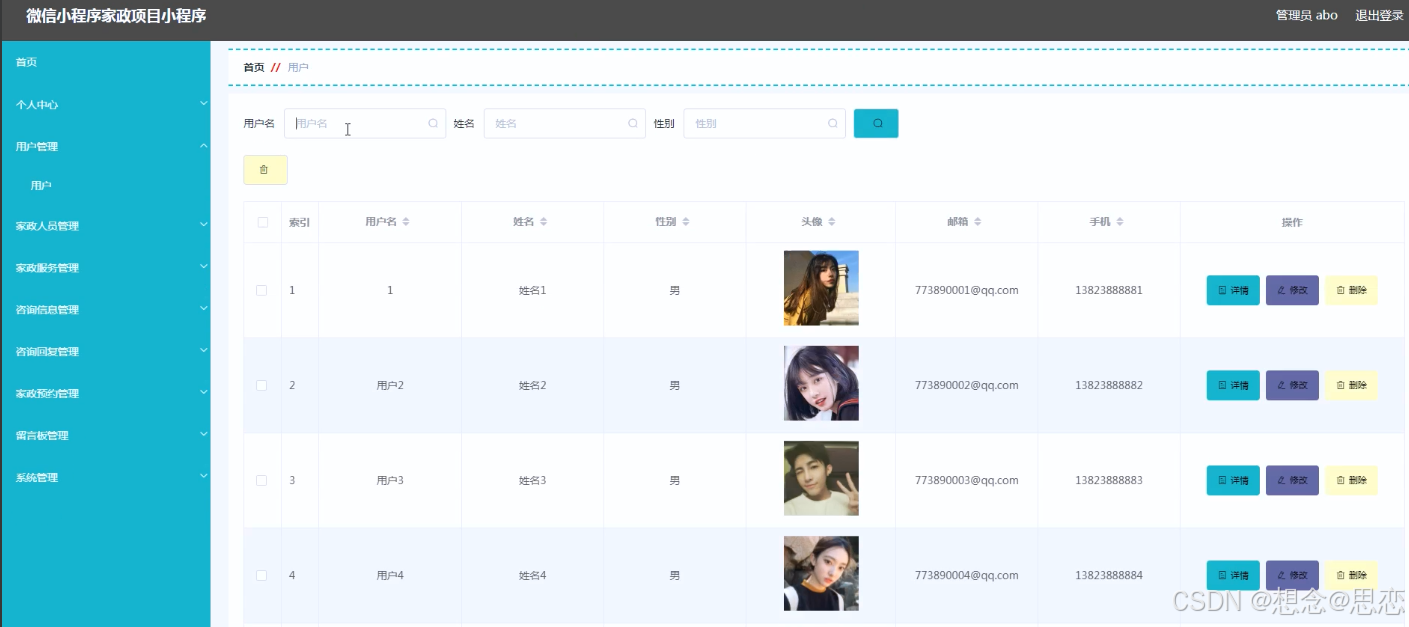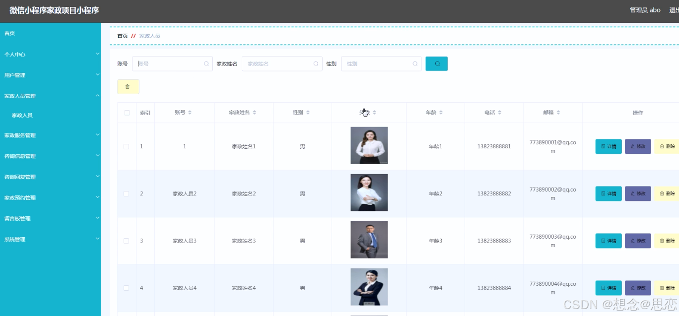 管理员可以对家政人员信息进行修改删除操作。具体界面如图5.2所示。