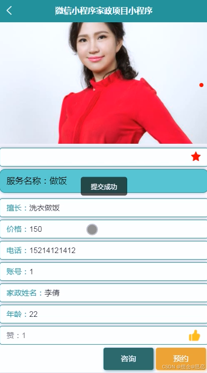 用户可以对家政服务信息进行预约和收藏操作。界面如下图所示: