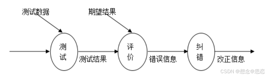 任务:消除软件故障,保证程序的可靠运行。测试与纠错的关系,可以用图6-1的数据流图来说明。图中表明,每一次测试都要准备好若干必要的测试数据,与被测试程序一道送入计算机执行。通常把一次程序执行需要的测试数据,称为一个“测试用例(Test Case)。每一个测试用例产生一个相应的“测试结果”。如果它与“期望结果”不想符合,便说明程序中存在错误,需要用纠错来改正。